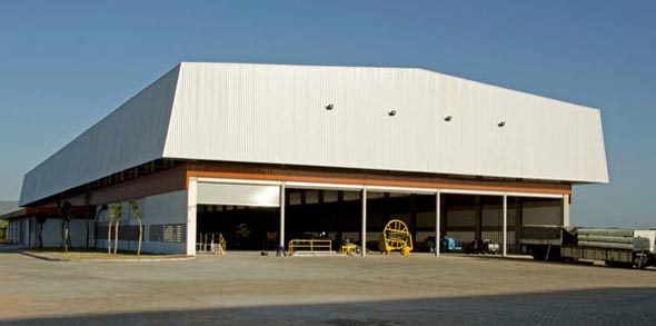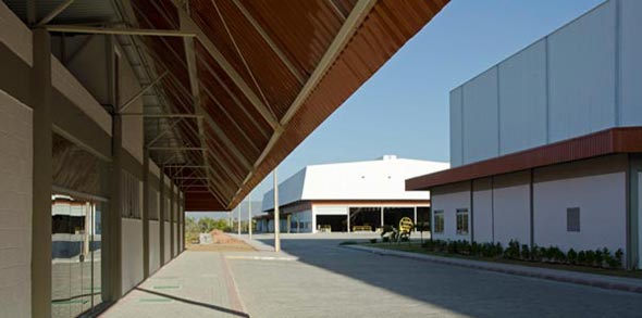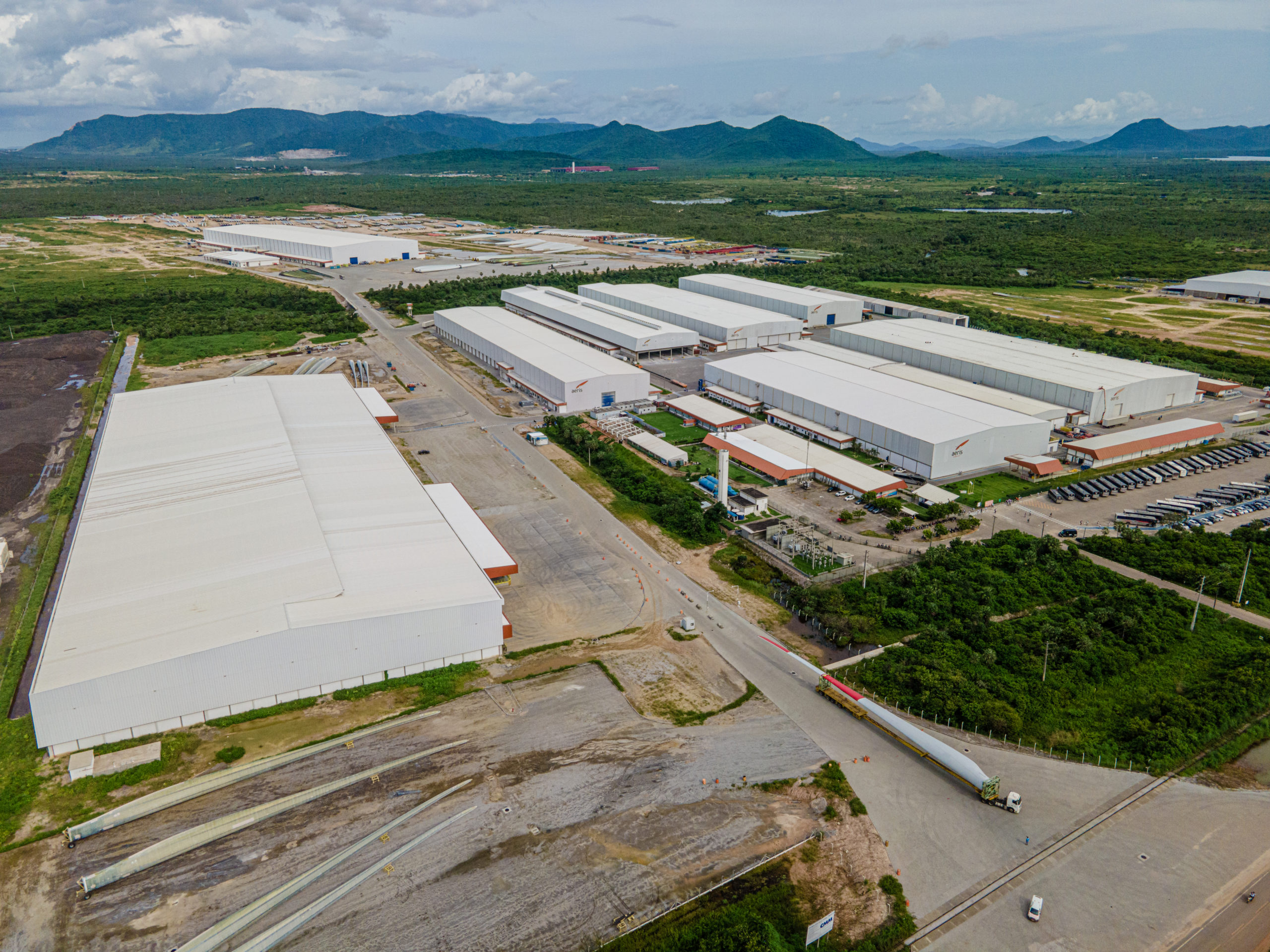 Fábrica de pás para aerogeradores constando de 8 galpões com pontes rolantes, dos quais, 7 são climatizados. Dois pontos merecem destaque: (1) a necessidade de controle do ar interno através da interação da arquitetura com a central de utilidades e (2) solução viária para manobra de carretas de 70m para o transporte de pás.